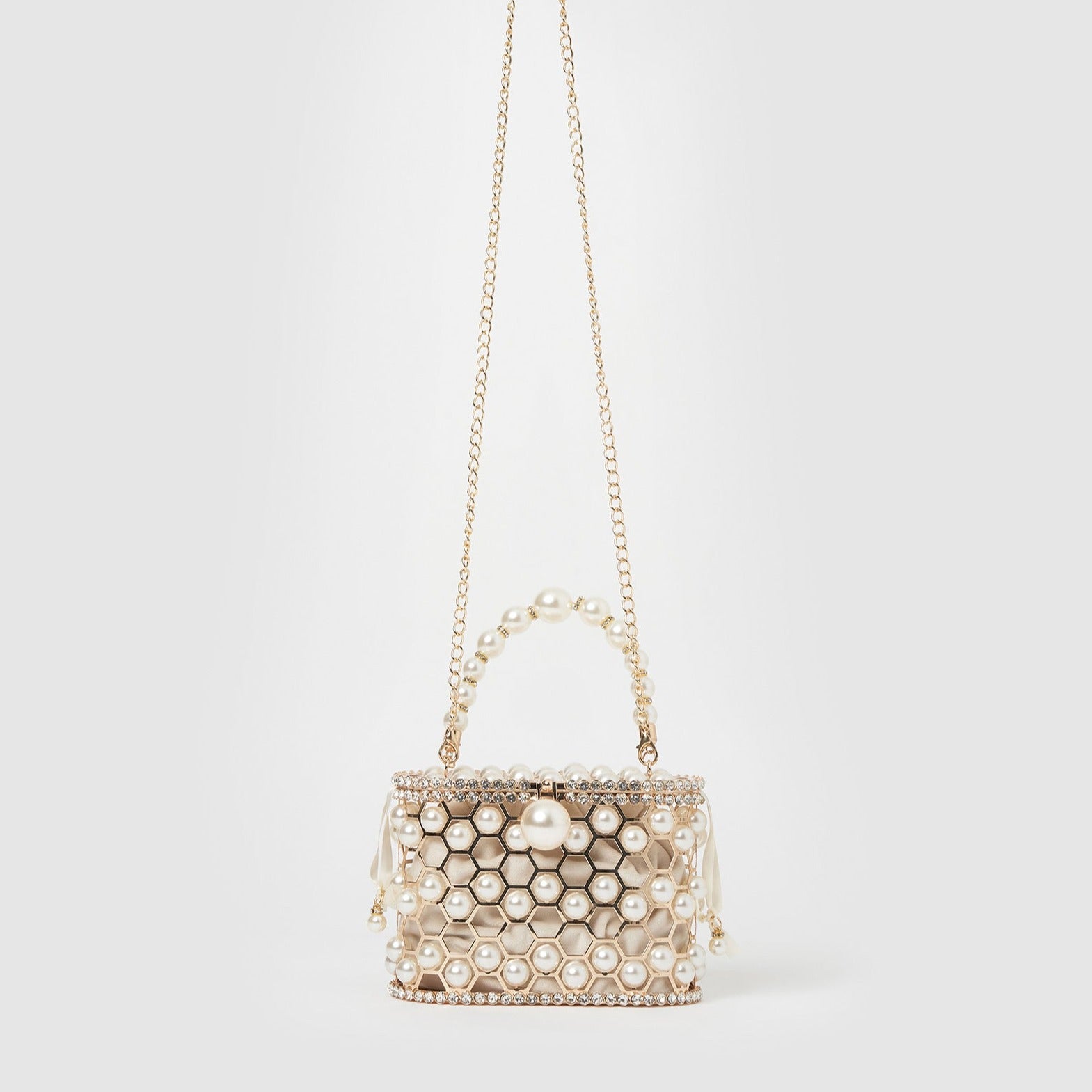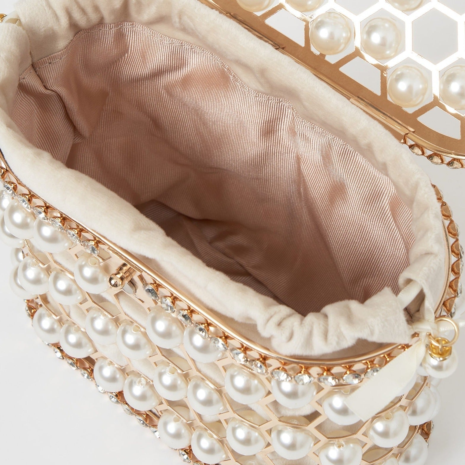 The Cara Pearl Bag is the perfect accessory for any outfit. Its white pearl exterior is adorned with gold detailing and beautiful gemstone features, creating an elegant and stylish look. Carry it to your next event to make a statement.