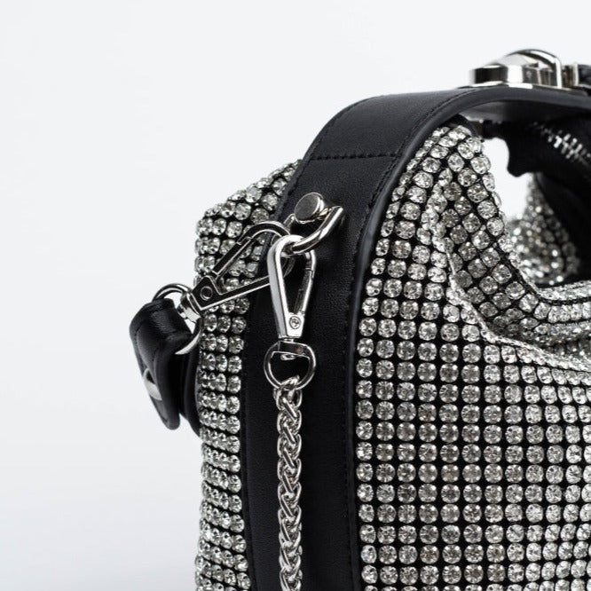 The Dazzle croissant is the essential evening bag this season. Add a dash of bling to your outfit with crystal rhinestones in a chic and easy to carry and secure design.