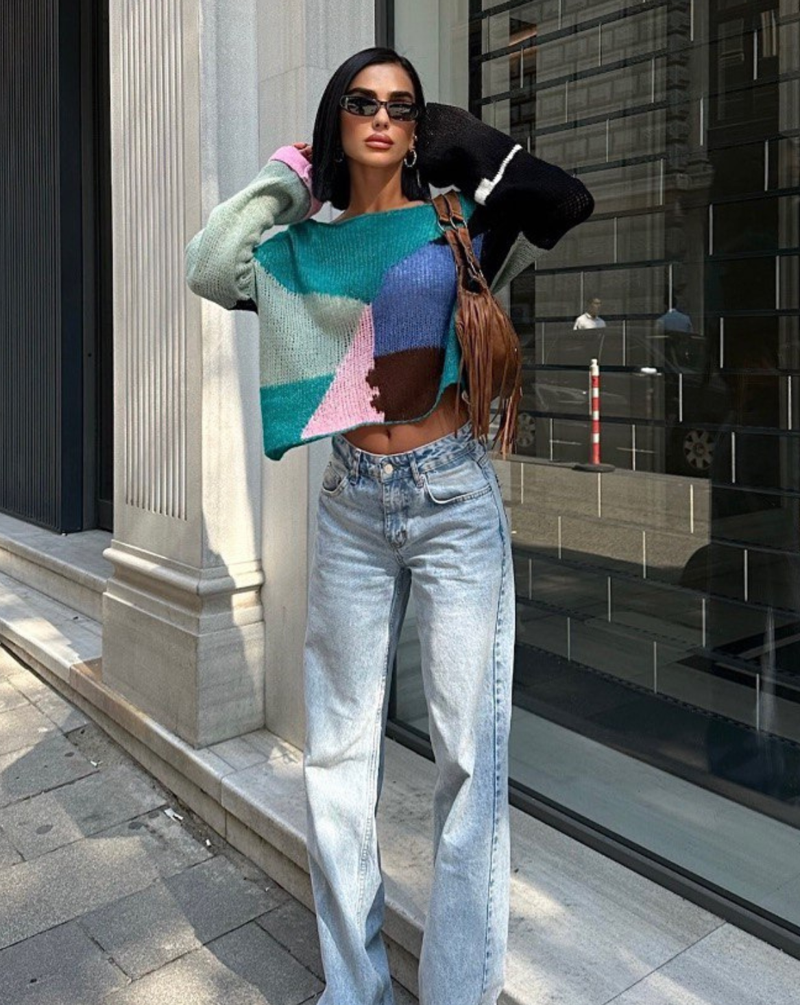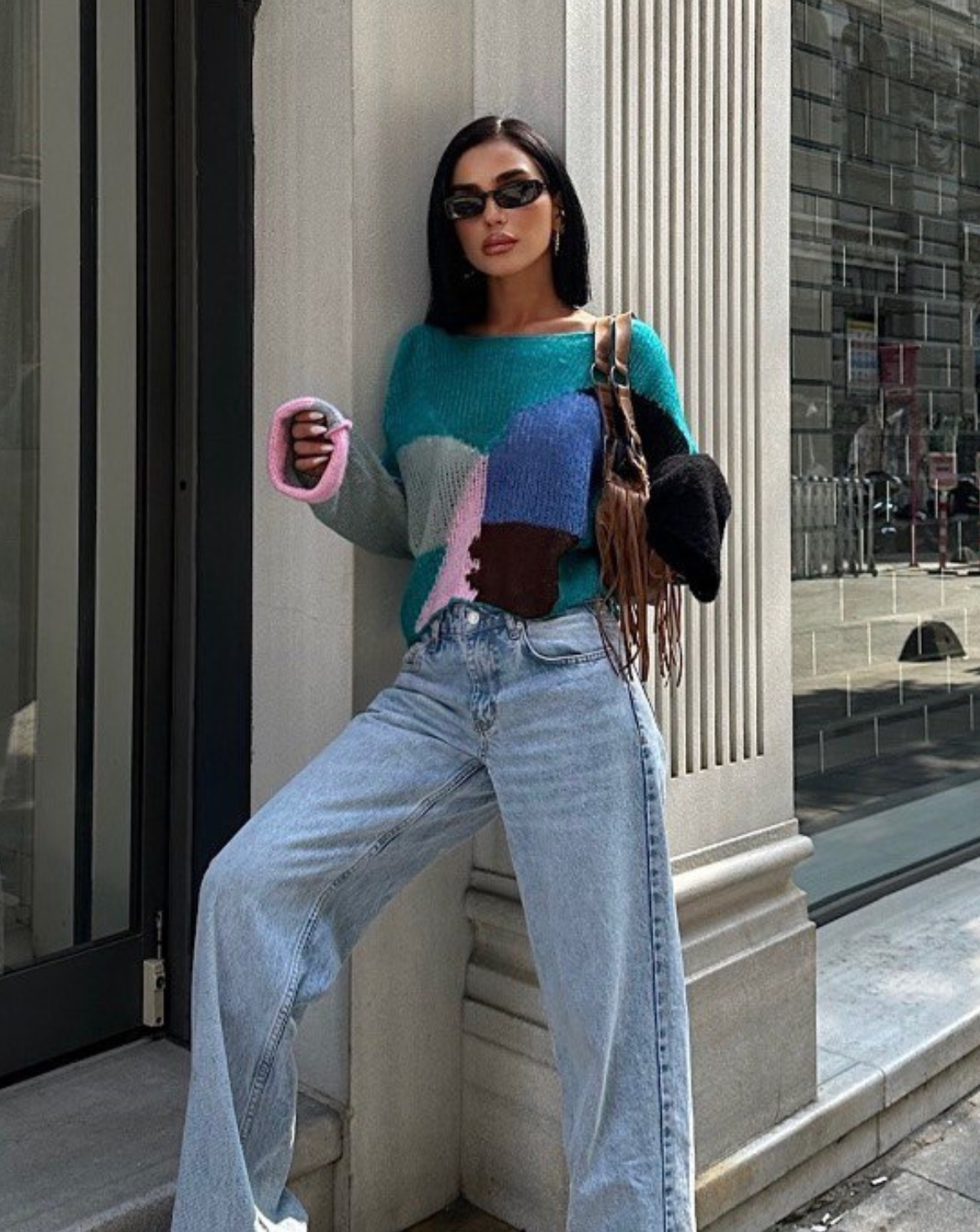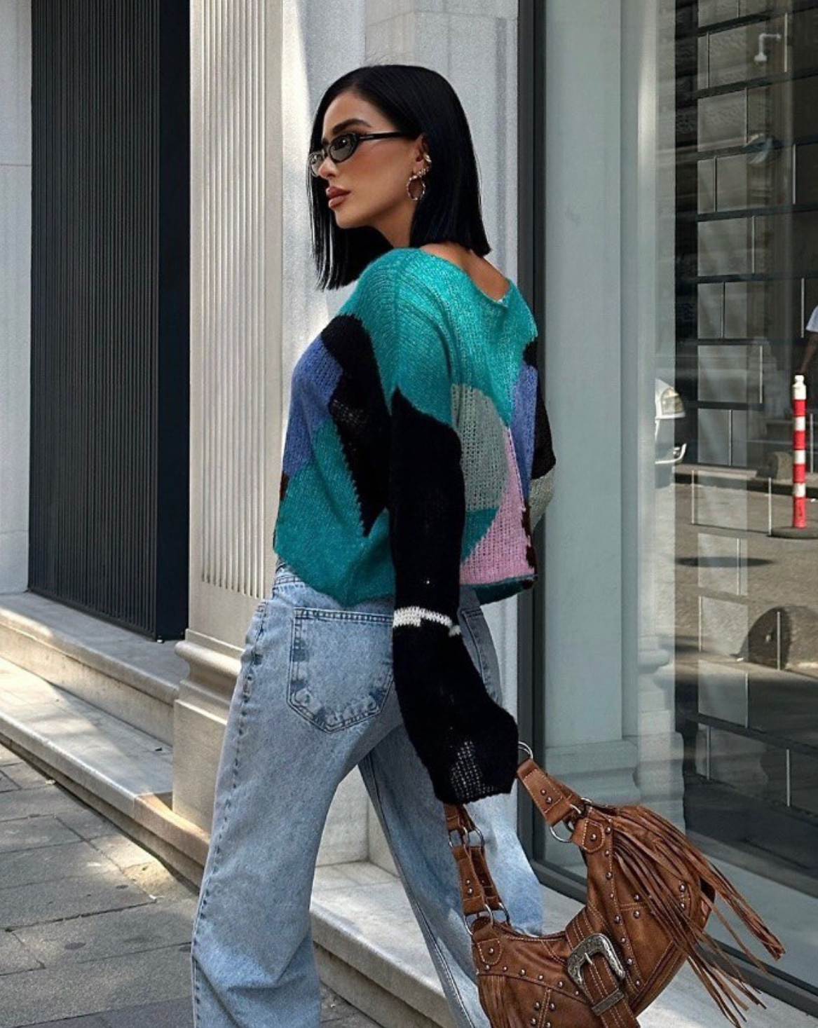 This sweater has an abstract, colorful design with a mix of lively shades.